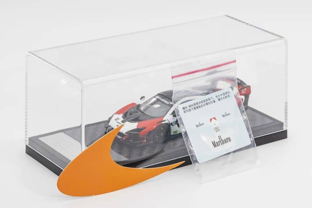 模型的包装采用黑色开口纸套,亚克力有机罩子,塑料底座,金属铭牌,底座有碳纤维纹路刻画,整个模型的档次提高不少。前面也讲过,这款模型配送了万宝路的水贴纸,而产品合格证的外形也是迈凯伦的标志。值得一提的是这款模型有迈凯伦正式授权的,这个也是大品牌的优势之一。