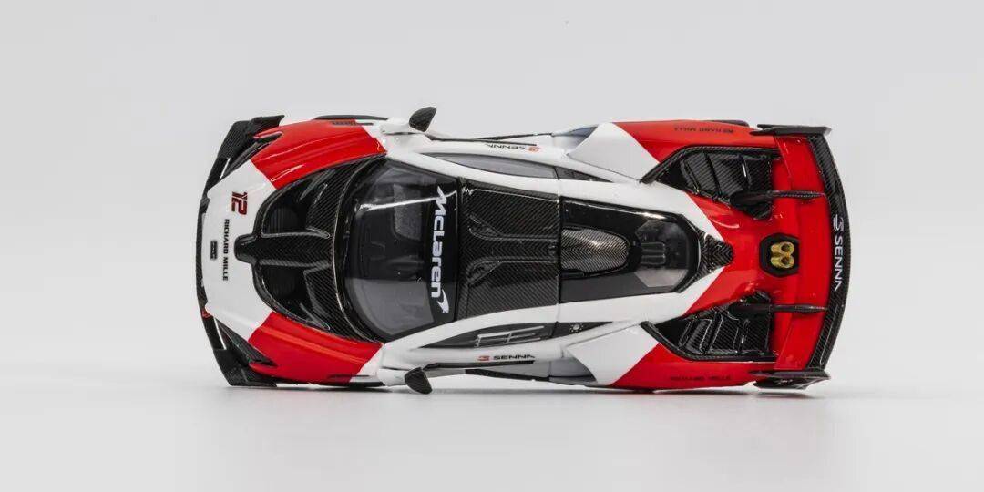 相对于1/64比例模型来说,LCD的这款Senna GTR内饰刻画也算比较到位,特别是桶式座椅,采用了LCD特有的纺翻皮涂料,安全带和仪表盘细节也是有所刻画的,车头的进气口结构也是有做出来的,拆模型的时候掉了一边;模型的发动机也有碳纤维贴纸细节。车头的碳纤维是左右对撑的,雨刮器也是和挡风玻璃一体成型,然后再画成黑色的。发动机舱两边有镂空的导风口,而且这个位置都是碳纤维贴纸覆盖的,尾翼下方有双出的排气,排气管向上,估计能提供一些下压力。模型的车顶有类似F1的进气口,而且也是覆盖了对撑碳纤维的,A柱一直延伸到发动机舱的碳纤维也是左右对撑的;车顶还有浮雕的蝴蝶门合页结构,通过发动机舱上方的透明窗能够看到一些发动机细节;排气管为全黑色,质感一般。