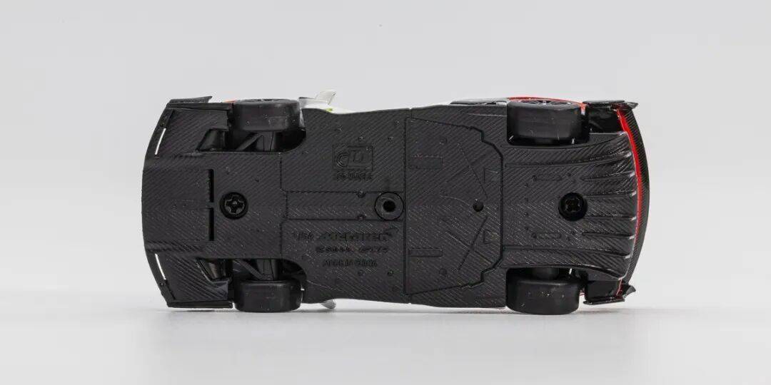 相对来说,超跑车模因为空气动力学导致结构复杂,外形是比较难还原外形的,这款Senna GTR的外形结构和空气动力设计比较复杂,起码上目测这款模型在形准上没有问题。模型的漆面为白色低橙色涂装,漆面质感不错,再加上大量的碳纤维,整体外观是非常好看的。模型的尾翼、车头侧风刀、前轮导流口、侧裙、AB柱、车门部分、车顶进气口、前唇、前盖中央后部等大面积都用了碳纤维贴纸,尾部扩散器是浮雕的碳纤维效果;整个模型的做工在1/64比例中还是挺复杂的;模型侧面的的标志都是移印的,侧面还有小透窗,模型也有还原,车顶还有天线细节。