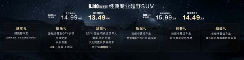 为回馈用户厚爱,北京越野同步推出六大尊享礼遇,覆盖实用装备赠送、流量服务、专属补贴、质保保养及道路救援等多个维度,从购车到用车全周期为用户保驾护航,以满满诚意助力每一份越野梦想落地。从赛场荣耀到家庭出行,从技术突破到模式创新,北京越野始终以硬核实力回应用户期待。BJ40系列多年来积累的庞大用户基础,以及多款车型在细分市场的亮眼表现,印证了品牌的市场号召力。
