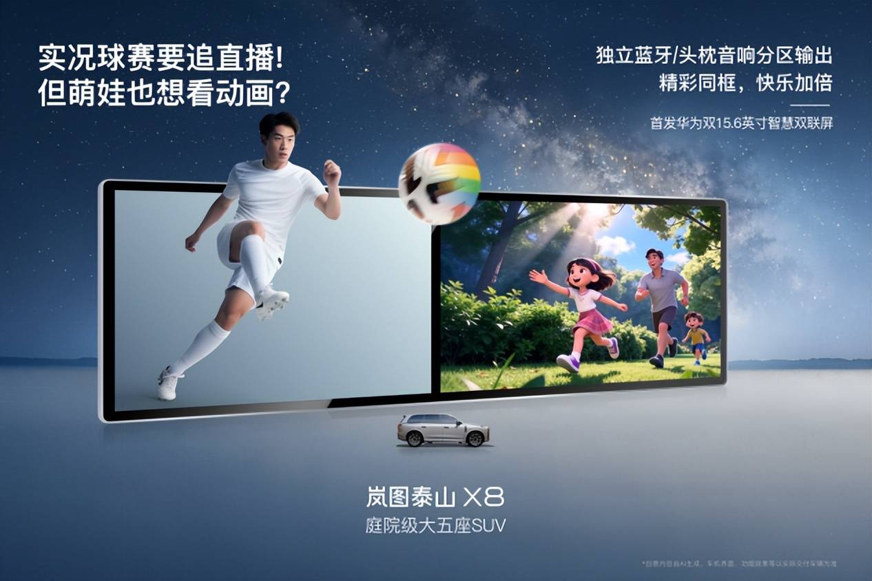 岚图泰山X8的智慧座舱能力,并未局限于前排双屏。基于华为新一代座舱平台,其打造了一个灵活、智能的多屏影音生态系统,核心体现为“影音流转”与“全车同看”两大功能。
