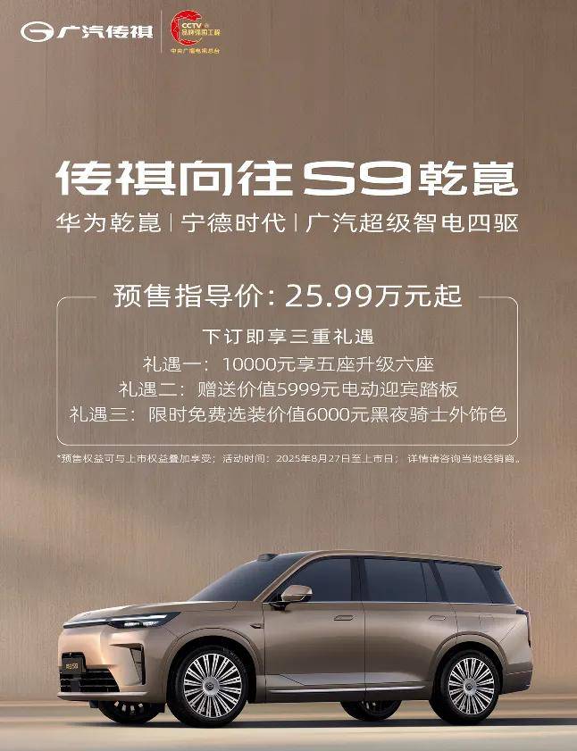 广汽传祺向往S9乾崑,定位家庭智能旗舰SUV,预售的价格为25.99万元起。虽然是这个细分市场的后来者,但向往S9是带着十足的“用户思维”而来,成为25万级别唯一实现“三大全系标配+一大舒享满配”的车型。