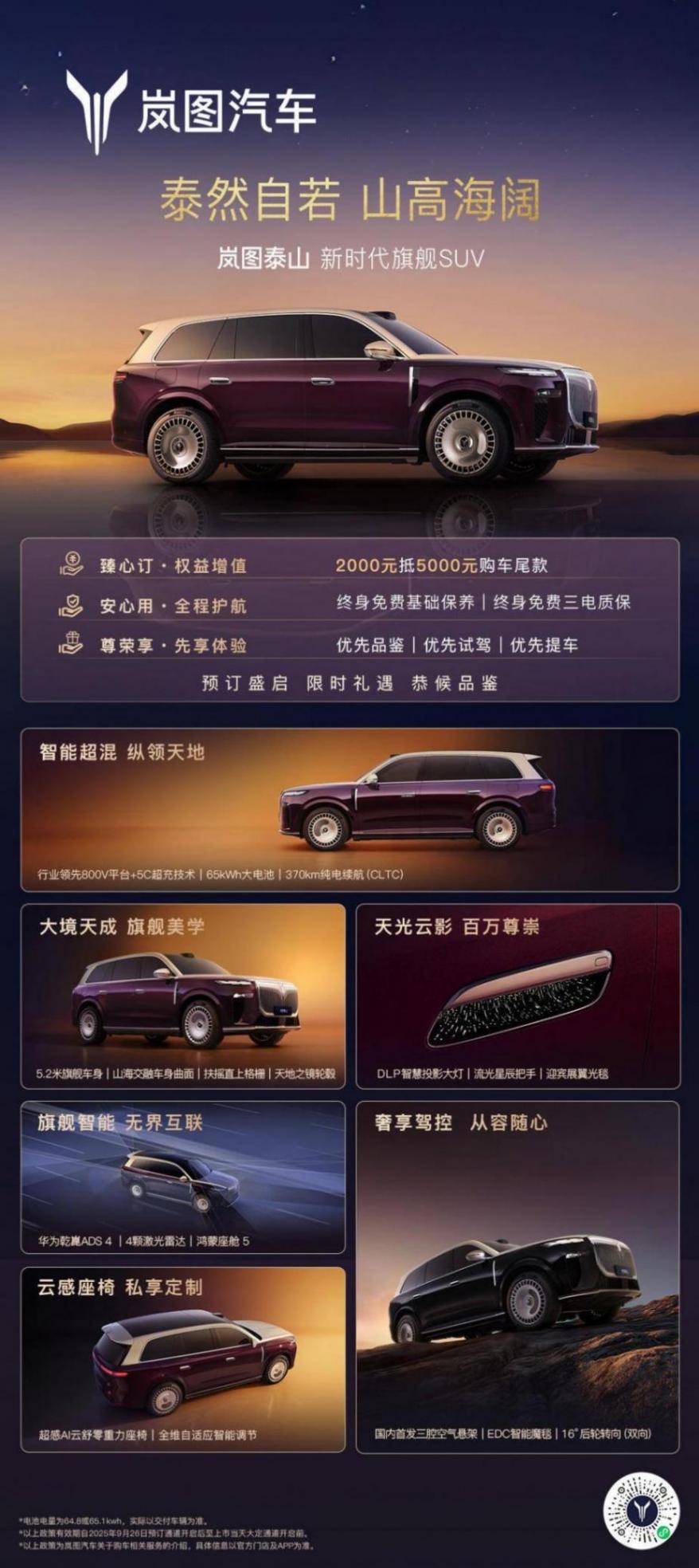 2025年9月26日晚间,岚图旗下全新旗舰大型SUV——泰山正式开启预订,官方并未公布新车价格,但已推出包括2000元订金抵扣5000元尾款、终身免费保养、三电终身质保等多重尊享权益。