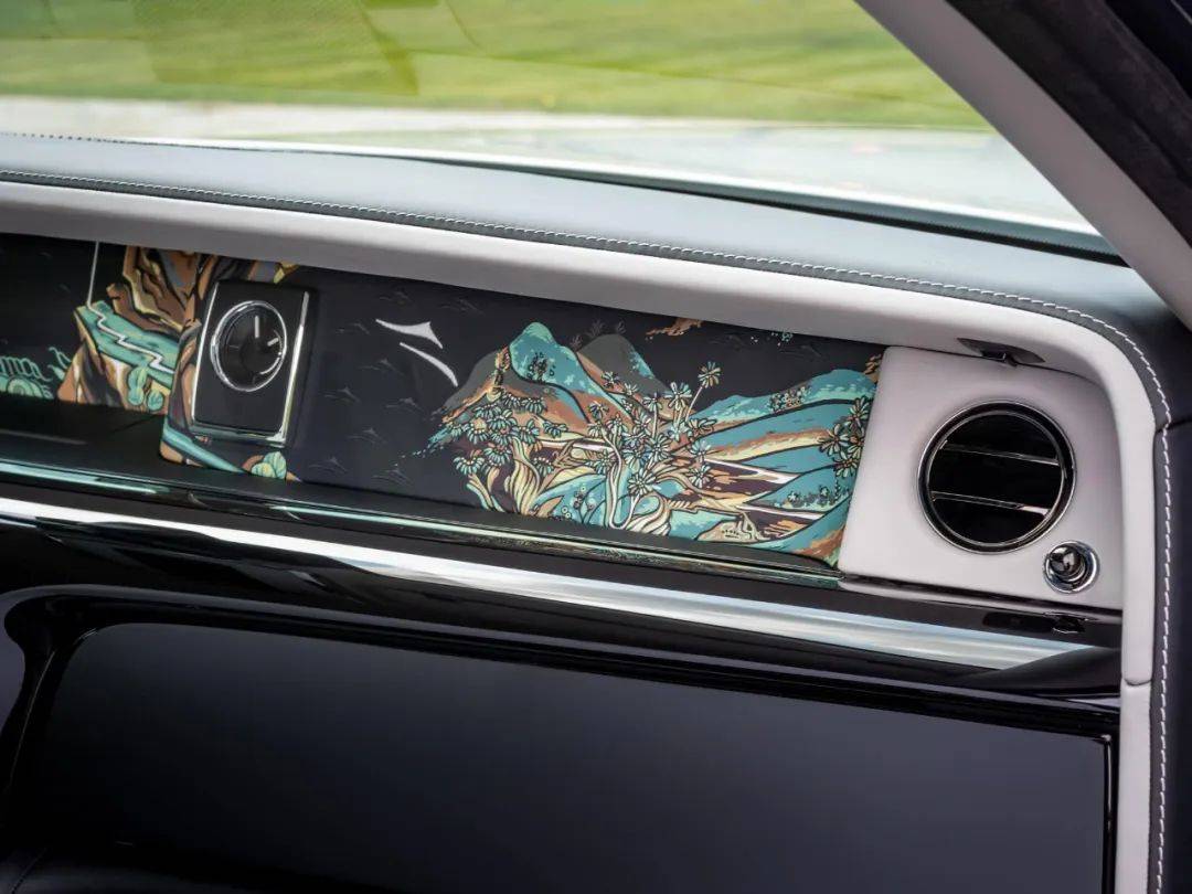 幻影长轴距版的车内到处都是壁画元素。在仪表台的画廊里,一块被透明面板盖住的皮革,采用中国减版木刻风格进行了手绘。
