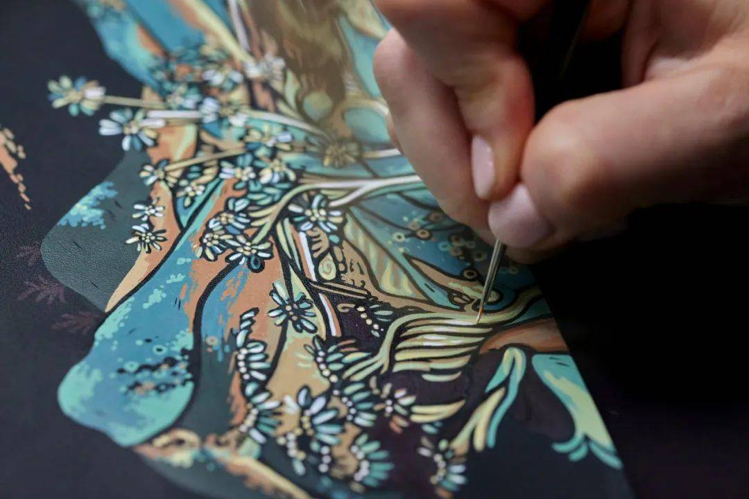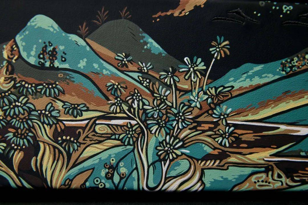 劳斯莱斯定制部门使用源自敦煌壁画的颜色,一层一层地上色,并有意露出一些黑色皮革底色,让画作看起来像木刻版画那样有立体感。