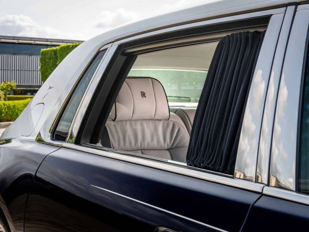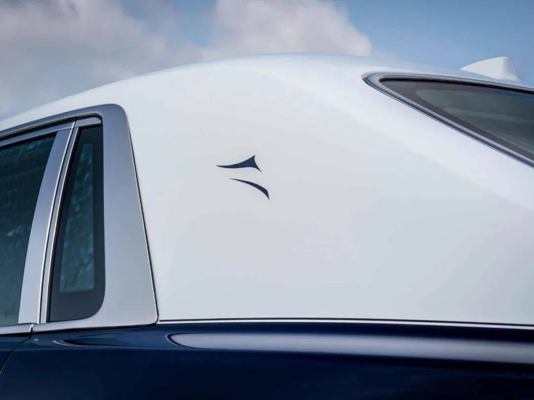 黑色皮革上还绣着“Silken Spirit”图案,这个图案由定制设计师冯帅设计。“Silken Spirit”标志的灵感来自劳斯莱斯的欢庆女神立标,现在看起来像是披上了中国丝绸。这个标志也出现在幻影车外。
