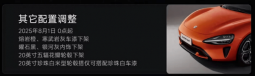 7月25日,小米汽车在最新发布的答网友问中正式回应近期产品配置调整决定:自8月1日零时起,小米SU7和小米SU7 Ultra将下架熔岩橙、寒武岩灰两款车漆颜色,曜石黑与银河灰内饰,以及20英寸五辐花瓣轮毂等配置选项。这一调整迅速引发市场关注。