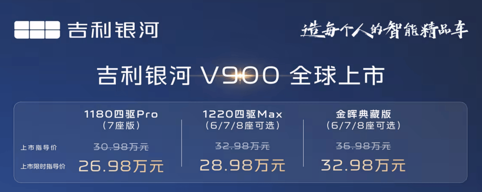 轱辘哥获悉,吉利银河V900限时指导价为26.98万元-32.98万元,共推出三款车型。相比原先的预售价,银河V900的限时价格下调了5万元,大大超出预期,别克GL8、岚图梦想家、腾势D9等最新劲敌来袭!