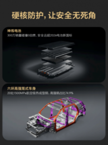 对于新能源车型,其搭载的“神炼电池”已提前满足即将实施的新国标安全要求。该电池技术历经五菱旗下300万辆新能源车的市场验证,保持了 “零自燃” 的纪录。
