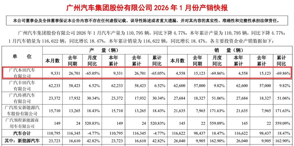 广汽集团1月份唯一出现销量同比下滑的品牌就是广汽本田,1月销量跌至4558台,同比下滑69.86%,相比去年12月超过5万台的单月销量,环比下滑更是高达91%。说实话,2026年开年首月广汽本田就出现比“拦腰斩”还可怕的同比环比双下滑,真的是出乎意料。