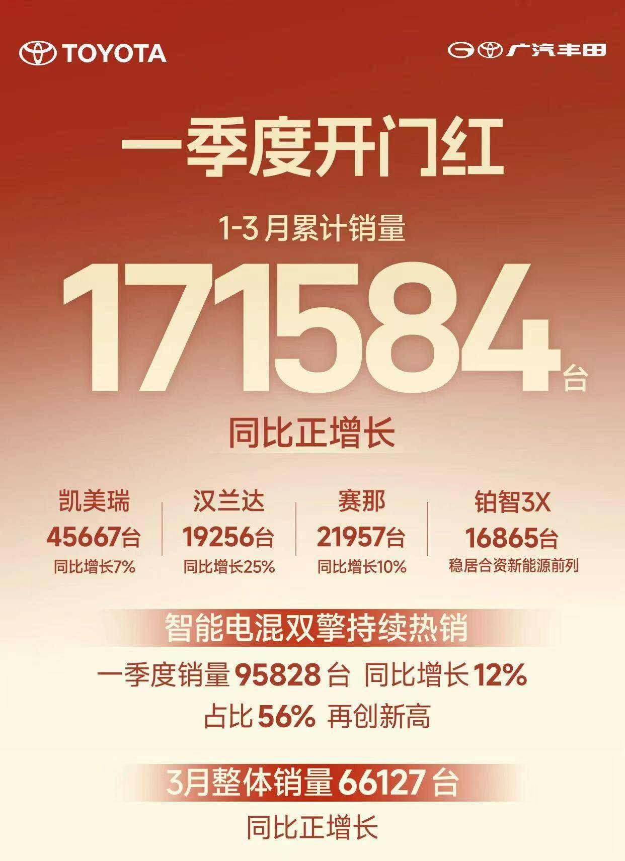 合资品牌也都陆续加入了每月1号的销量公布战。根据广汽丰田数据,3月品牌整体销量为66127辆,同比实现增长。1-3月,广汽丰田累计销量达到171584辆,其中智能电混双擎累计销量占比超过一半,达到95828辆。新能源方面,铂智3X累计实现销量16865辆。3月29日,广受市场期待的铂智7已经完成上市。新车上市后,有望成为广汽丰田新能源市场的又一增长引擎。