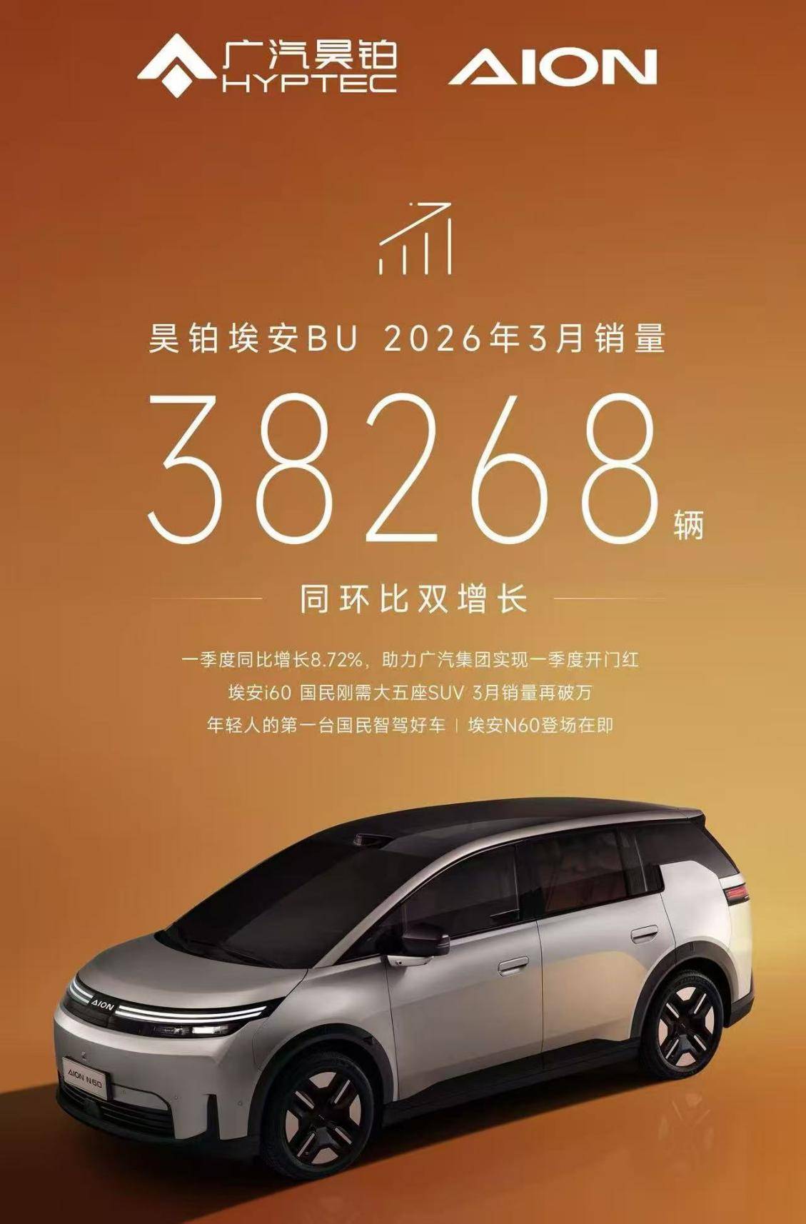 根据昊铂埃安BU(即广汽昊铂与埃安合并组建的业务单元)公布的数据显示,3月昊铂埃安BU累计销量为38268辆,一季度累计销量75389辆。同比增长8.72%。3月份,昊铂品牌正式发布了其2026年的首款新车昊铂A800。4月埃安将正式推出其全新车型埃安N60,预售价15万元以内。