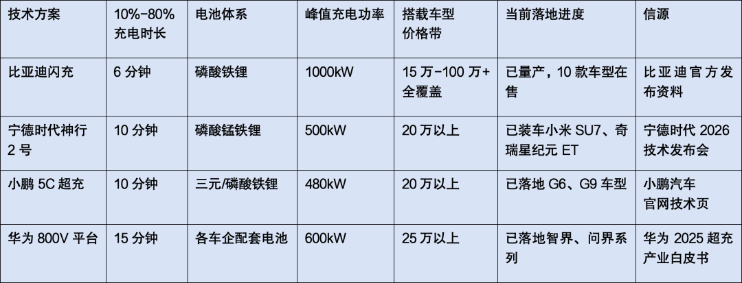 我们把当前主流的超充方案拉通对比,就能看出比亚迪的技术优势到底在哪,是不是真的“领先行业一代”。