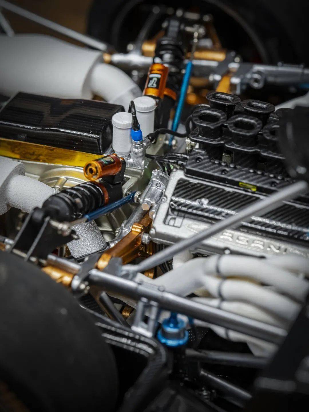 因为模型尾盖可以直接拿走,可以更好观察模型的发动机,因此LCD在这款Huayra R的发动机上可谓用足了料,比之前的Huayra BC要强不少;AMG的V12引擎是独立的发动机结构,发动机缸体用了哑光银漆还原铝合金质感,还有蚀刻片的Pagani V12标志,汽缸盖则是碳纤维,管路也很丰富;发动机舱的支架是银色的,通过螺丝连接起来,质感很不错;模型的排气歧管表面是磨砂白色漆,质感很不错;应该说LCD的这款Huayra R发动机的做工算是今年来1/18合金全开超跑里做工最强之一了。