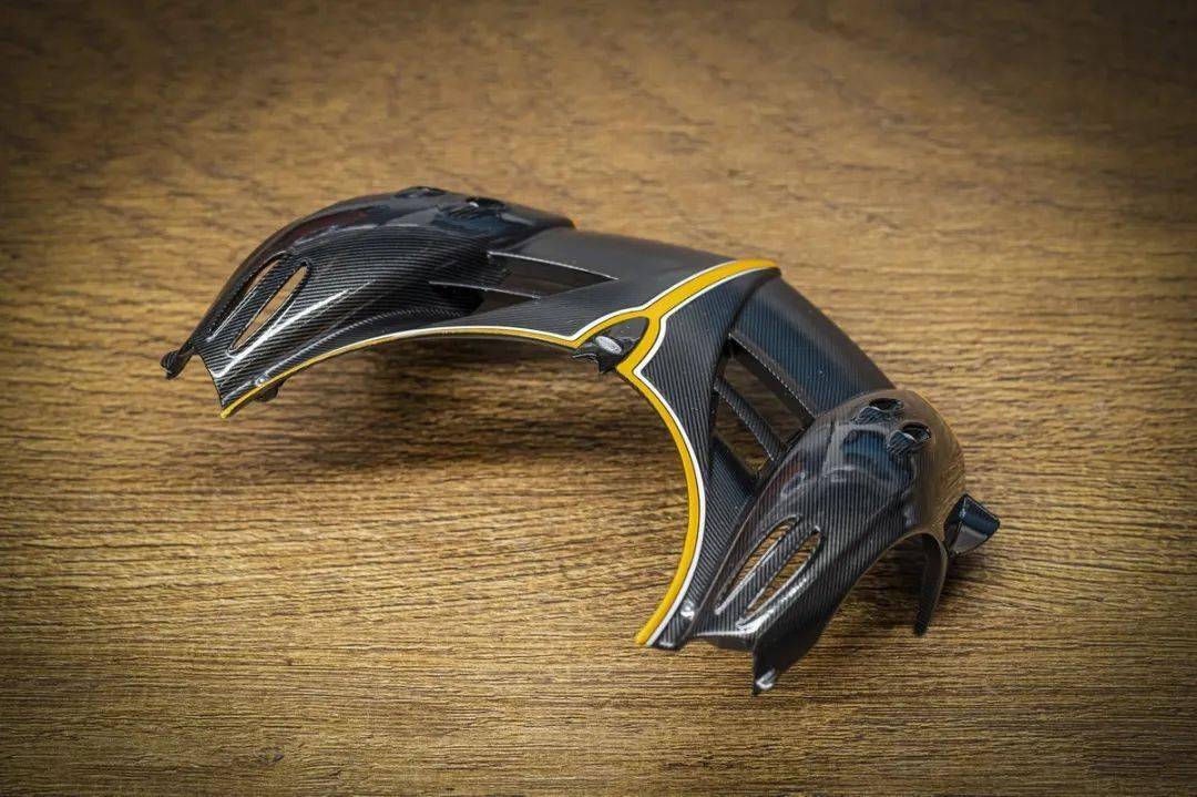 模型的后盖结构更为复杂,通风口也都是真实镂空的,前盖中央、前沿、尾翼支架上沿都有贴纸的拉边(黄色+白色);尾翼横翼结构复杂,模型还原度也很高,细节很丰富;后盖内侧也是全部覆盖碳纤维贴纸,同样是左右对称的,值得一提的是轮眉内侧模型也还原了复杂的通风网结构。