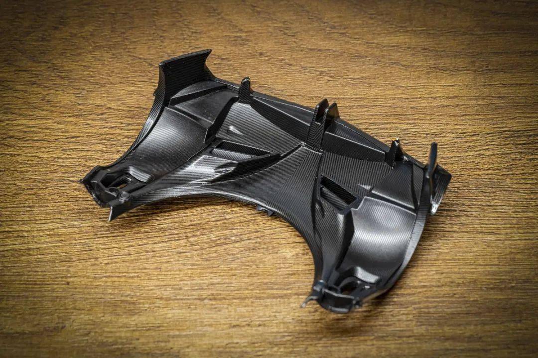 车顶的导风口可以拆下来,同样是全覆盖碳纤维贴纸,还有很多铆钉细节,边缘也是有拉边,通风口边缘貌似还采用了金属件;这个配件同样通过磁铁吸附,而且内侧的格栅也做了出来。