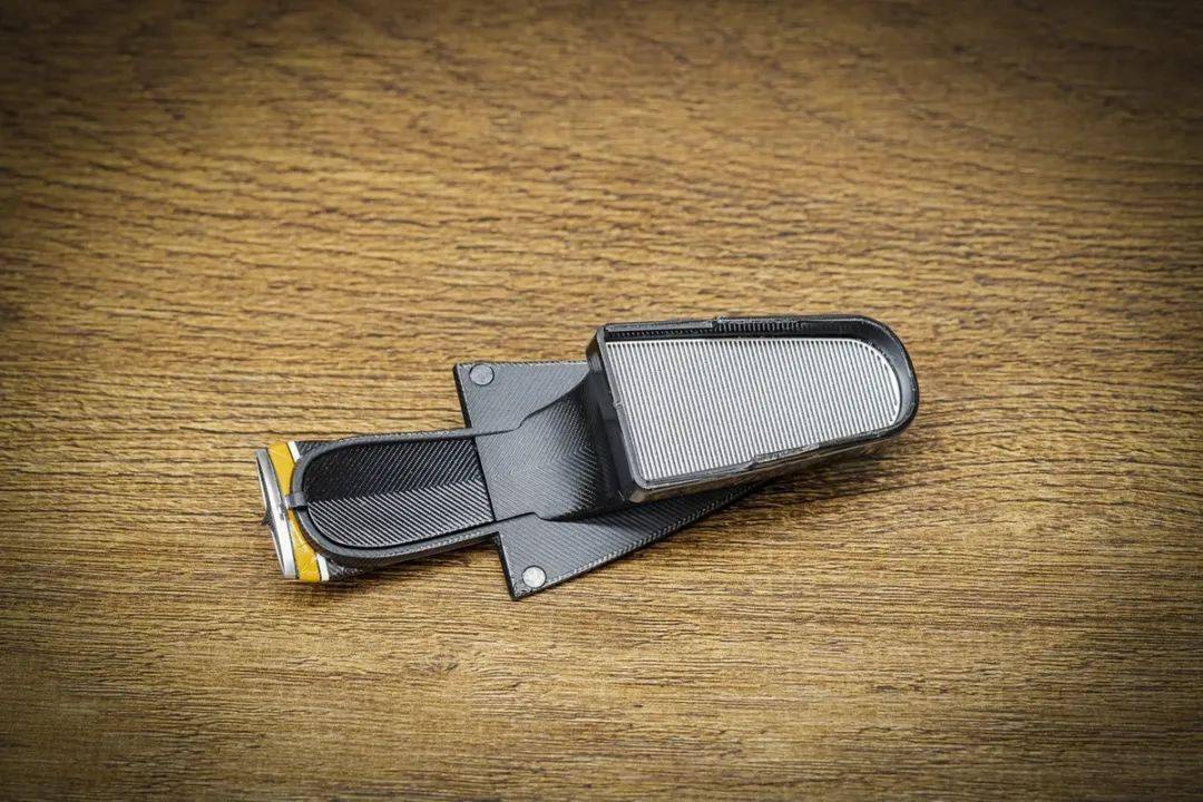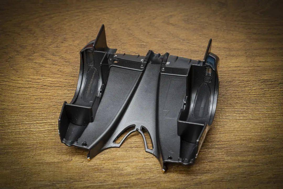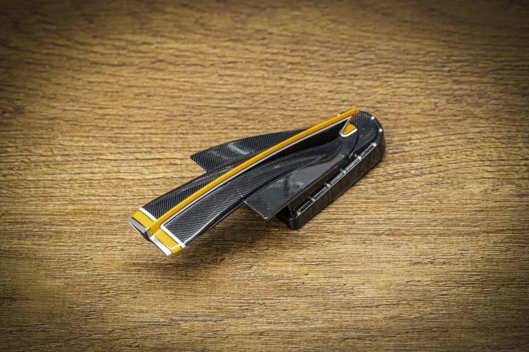 模型的前盖是独立的金属件,前盖中间和两侧的通风口都是真实镂空的,弧形的边缘还有贴纸的拉边(黄色+白色);前盖的内侧同样覆盖了碳纤维贴纸,而且也是左右对称的,吸附的磁铁也涂了黑色漆。