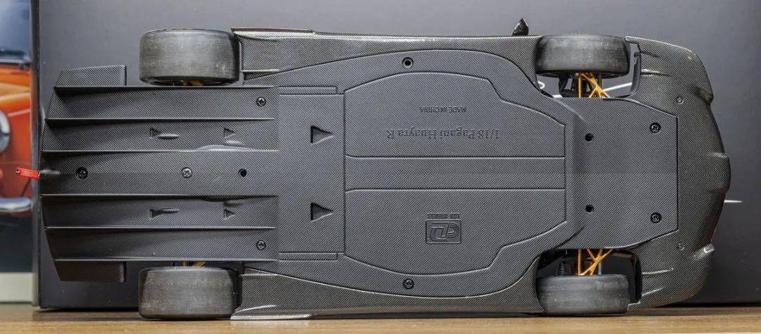 模型的底盘是金属的,而且采用表面成形的碳纤维纹路,这里也是左右对称的,模型的前唇和侧包围下方也是用了碳纤维贴纸;除了一些风刀和浮雕的通风口之外,也没有其他细节,不过估计真车也是这个情况,模型也还原了光头胎细节,而且厂家还对轮胎进行打磨,质感好不少。